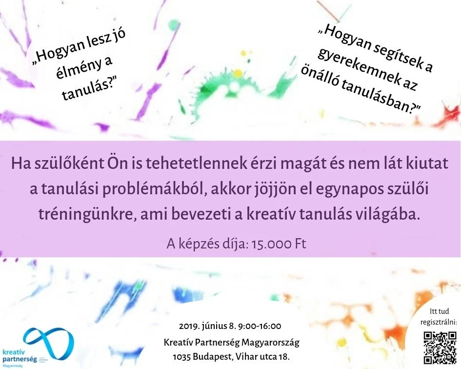 Szülői tréning: Hogyan lesz jó élmény a tanulás? 2019.június 8. 9.00-16.00