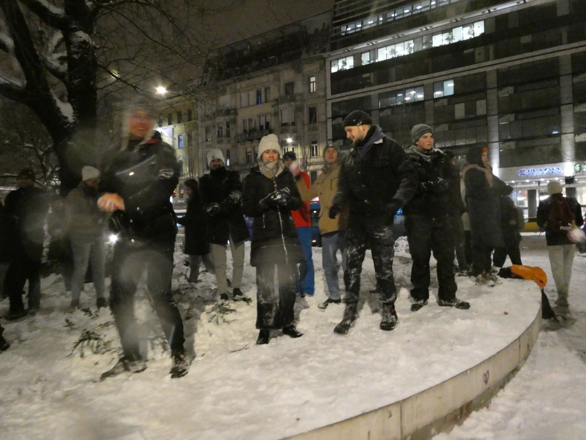 Óriási közösségi hócsata indult péntek este a Balaha Lujza téren, amibe mi is belecsöppentünk. Mindenki lelkesen gyúrta, dobta, hajította a hógombócokat, és akkora fergeteges buli hangulat kerekedett seperc alatt a főváros szívcsakrájában, hogy hó havon nem maradt.