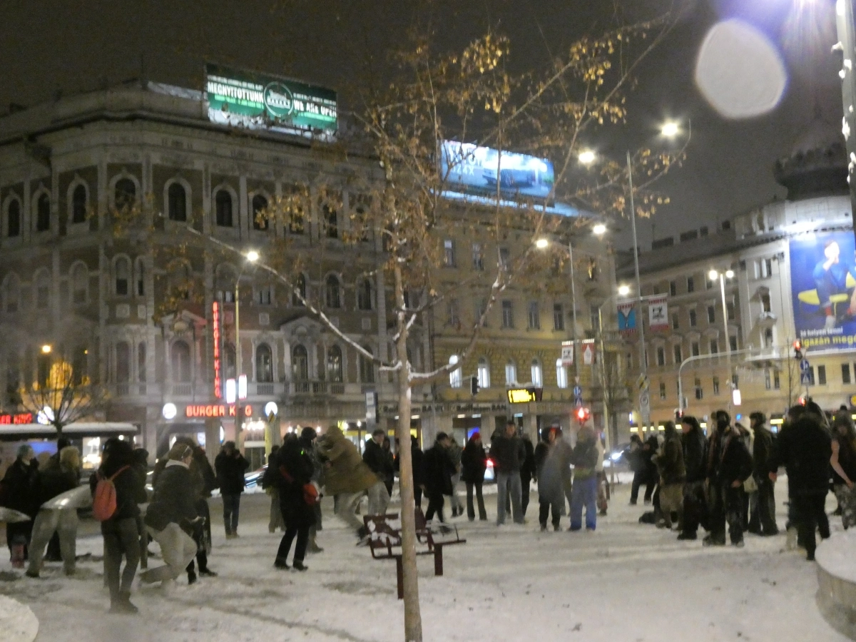 A szokatlanul hatalmas hóesés a fővárosi fiatalokat is felpezsdítette. Január 9-e, péntek 18 órára volt meghirdetve a Facebookon az a nagyszabású hógolyócsata, aminek a Blaha Lujza tér új közösségi tere adott helyszínt. (Még mindig szokni kell a látványt, hogy az egykori autóparkolók helyén ma egy modern, tágas tér várja az arra járókat.)